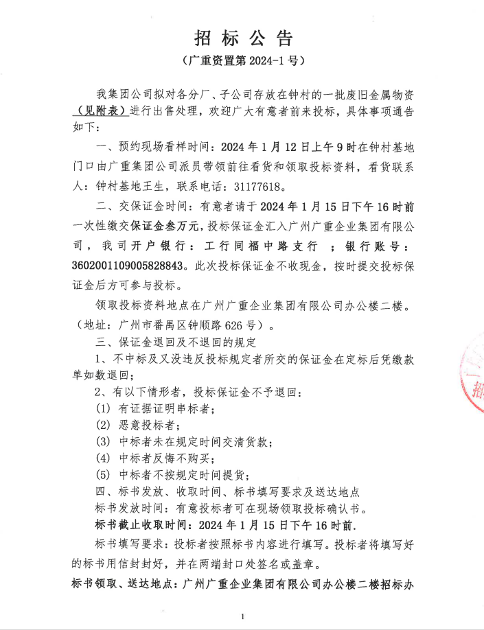 钟村废碳钢A、割渣类等物资处置(安博平台资置2024-1号)