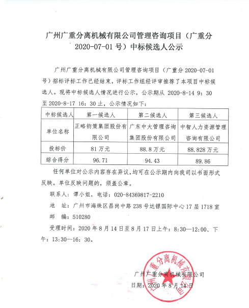 广州安博平台分离机械有限公司管理咨询项目中标公告