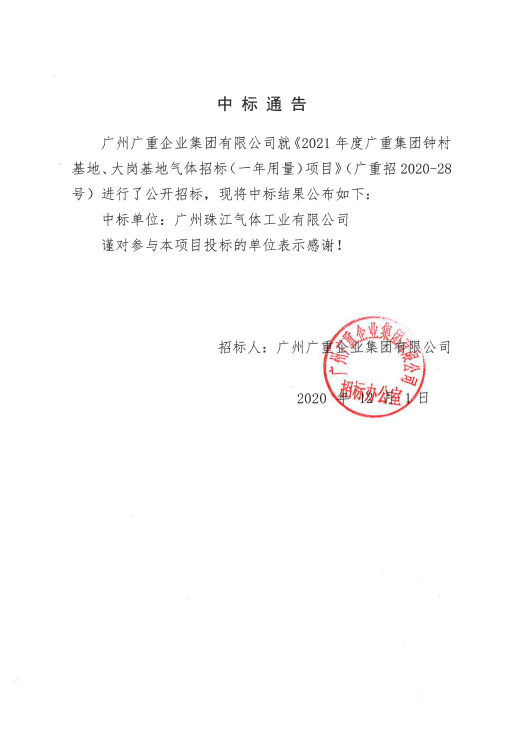 2021年度安博平台集团钟村基地、大岗基地气体招标(一年用量)项目中标公告