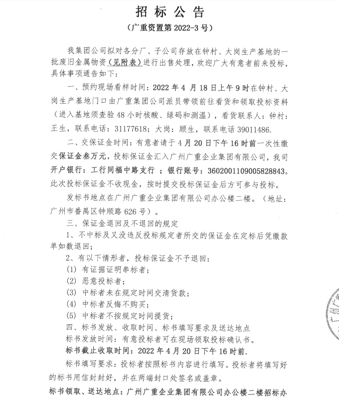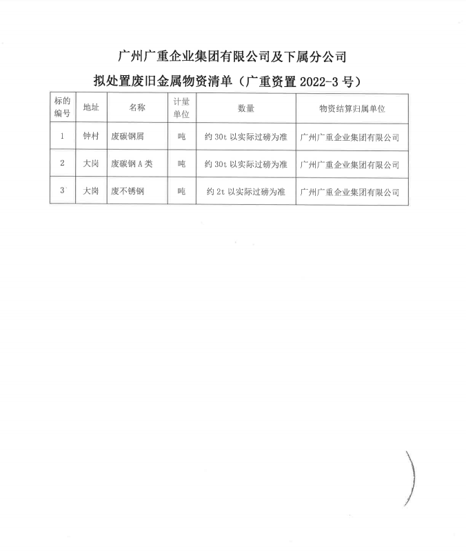 钟村、大岗基地废碳钢屑等物资处置(安博平台资置2022-3号)