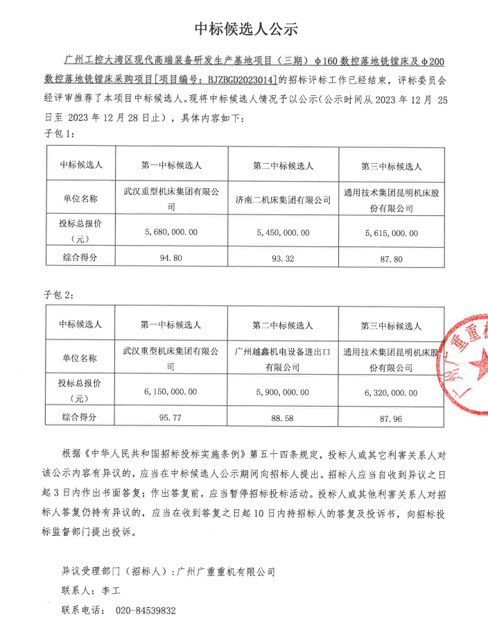 广州工控大湾区现代高端装备研发生产基地项目(三期)φ160数控落地铣镗床及φ200数控落地铣镗床采购项目中标公示